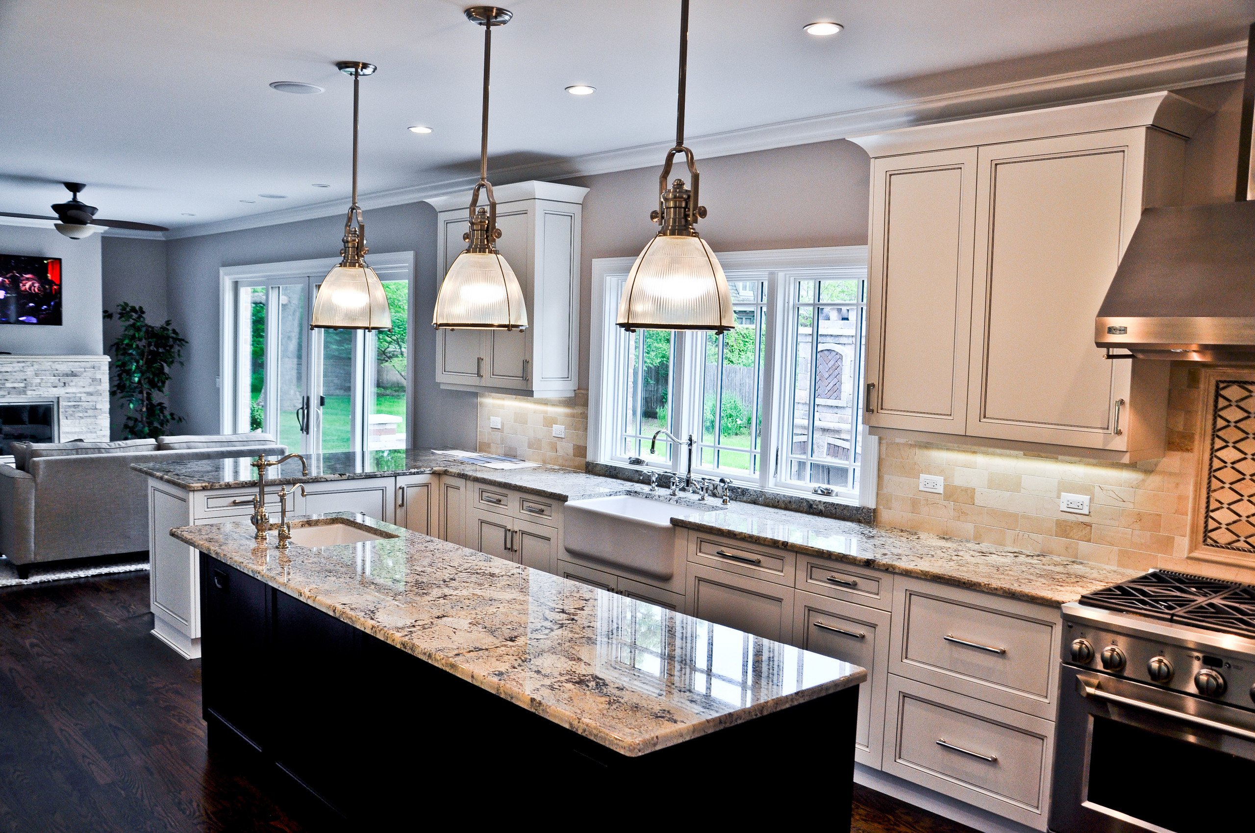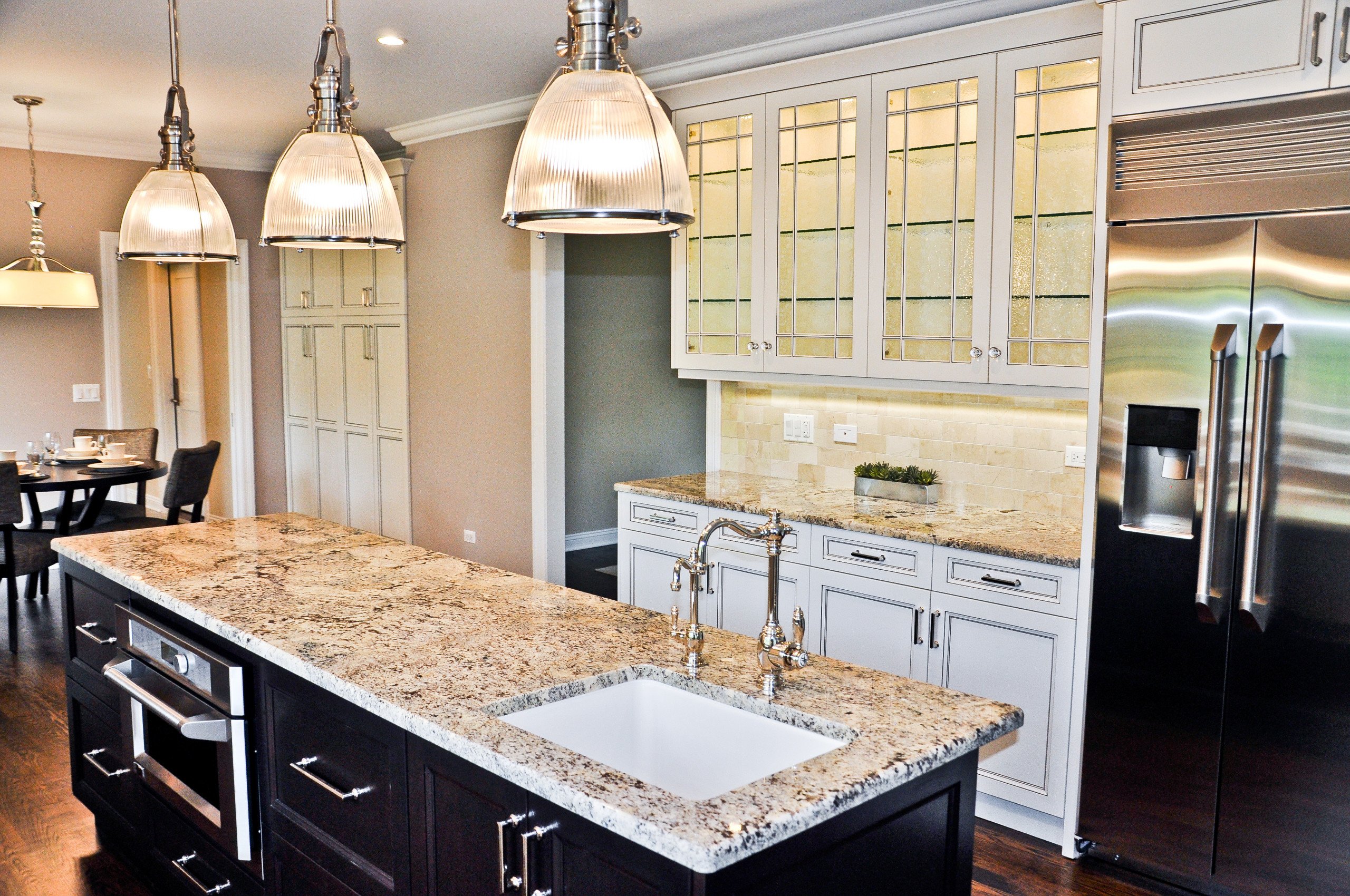 A classic two-tone color scheme gives this kitchen a lovely vintage feeling. Cream cabinets are brightened by the black pearl, which has a subtle sparkle of its own. This elegant yet cozy design goes well with antiques and ornaments of different styles.